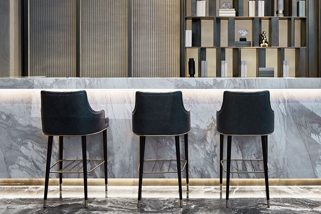J&A从宁波传统文化中提炼出“水”、“阁”、“瓷”、“漆”四种设计元素,与现代演绎手法创新融合,相得益彰。“水”元素提取于宁波历史悠久灿烂的河姆渡文化,以及靠海环水的环境特征,应用于空间整体动态与曲线造型。最为显眼的即是接待台旁边的屏风造型,将水流进行线形演绎延伸至地面,让空间富有流动之感。由宁波传统建筑“天一阁”,J&A提取了“阁”元素的灵感,在第二层空间设隔扇与栏杆回廊,整体空间呈现垂直、拉伸形态,视线开阔且比例完美。越窑青瓷为宁波非物质文化遗产,借鉴于“瓷”元素,J&A在空间中大量运用的石材、黑钢、墙纸等材料中,搭配出如瓷般细腻之质感与柔和之触感,打造视觉与触觉于一体的感官体验。作为宁波又一非物质文化遗产——泥金彩漆,以其制作精巧、色彩灵动绚丽而闻名。借助“漆”的元素,J&A将跳跃的色彩点缀在空间的视觉和软装体感中。
