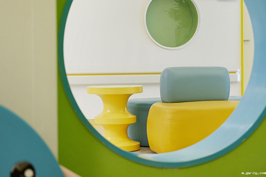 除了室内设计外,色彩丰富的导视标识设计更是空间里的点睛之笔。我们深刻解读了业主的需求,导向标识设计团队便摒弃了现有医院呆板、具象化的标识系统,将医院卡通形象小白熊进行抽象融合,为空间设计的整体性发挥了极大的作用。为了满足轻松趣味和绿色环保需求,病房内大面积的卡通软包铺设也保护了儿童的安全,空间内还运用节地、节能、控噪、净气等环保节能措施及人性化的智能设施,为儿童打造绿色健康的诊疗环境。
