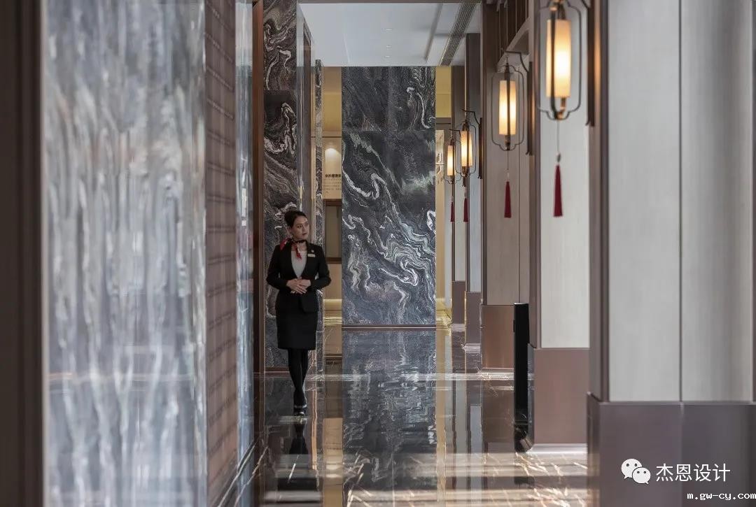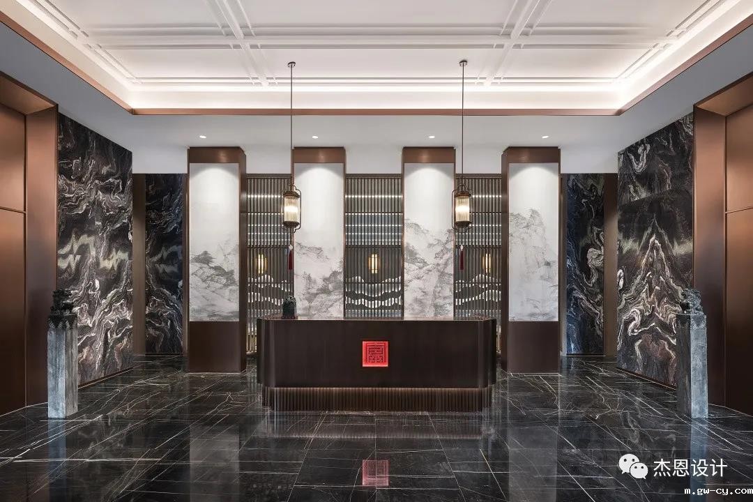 室内设计整体以木色渲染柔和色调,墙面使用“篆刻”的经典元素,并用最新的技术实现落地,整齐匀称古拙、却又有奇险壮丽。