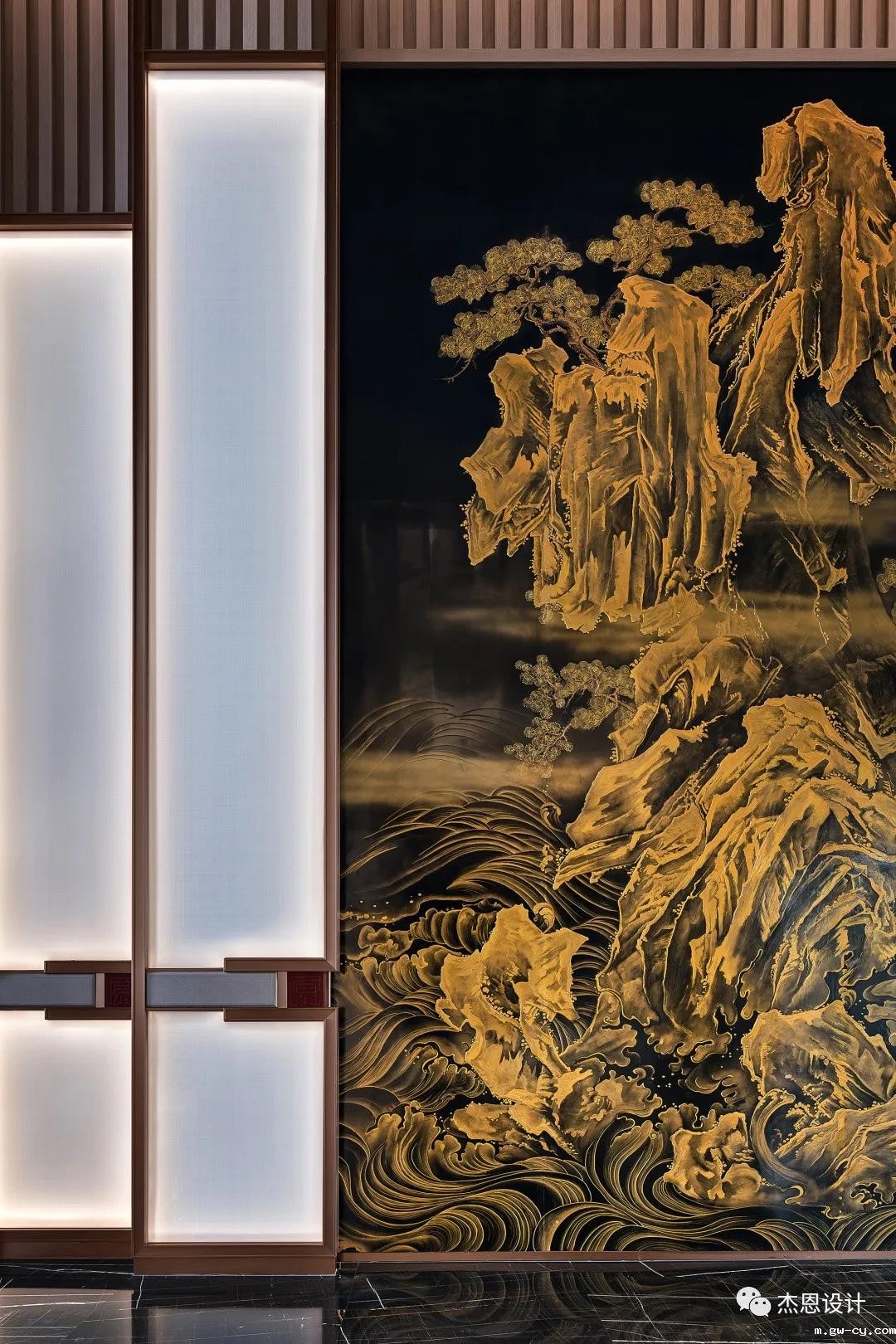 墙面以木灰、金属为胎,在胎骨上层层髹红漆,多达一二百层,至相当的厚度,待半干时描上画稿,然后再雕刻花纹。“雕镂”元素结合全新科技手段,将工序复杂的传统工艺“剔红”完美呈现,让空间充斥着传统气息的同时,引入盛京匠人的不灭精神。