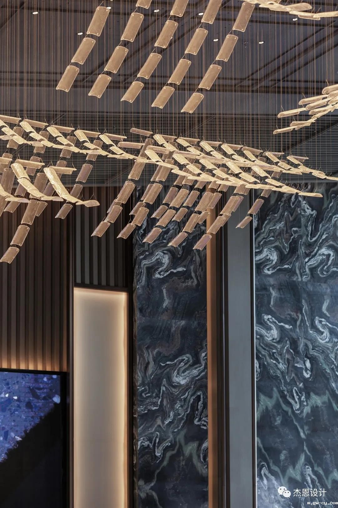 沙盘上方选用瓦片形式吊灯,以沈阳故宫建筑形式——八角重檐为设计出发点,提取建筑的围合形式进行装置艺术。