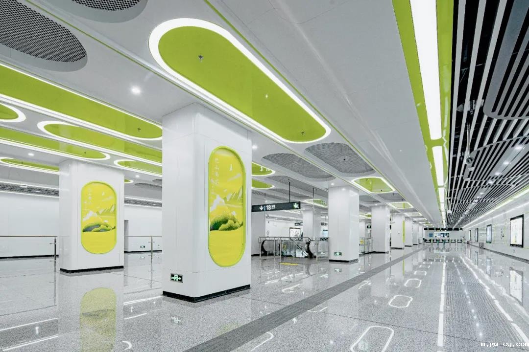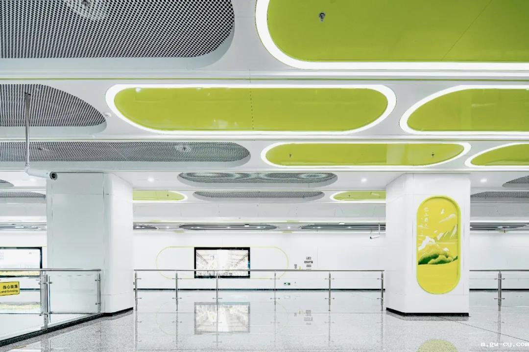 J&A 融合对天花、墙面、柱面、地面空间的整体构思,营造出流畅、舒适的建筑装饰艺术氛围。蓝绿两色代表蔚蓝天空与青草大地,孕育世间万物,将自然与城市轨道交通相融合,体现蓉城人民的包容与豁达。