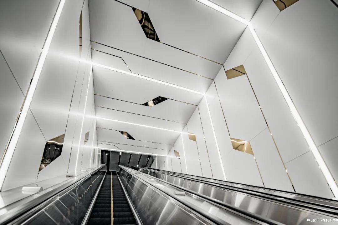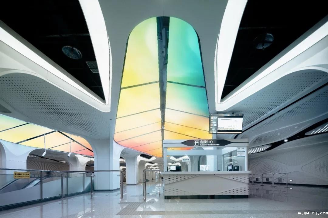 天府新站整体设计从真正意义上将“艺术”与“科技”的结合发挥到了极致,除了整体优美艺术造型外,更值得一提的是站点采用智能多彩灯光控制,根据不同时间段,灯光每20秒进行相应的渐变切换,营造出晨昏日出日落的云彩和天色,使人行走在地下空间依然能感受到户外的五彩白昼,舒缓的自然气息可以随时安慰忙碌的都市人。