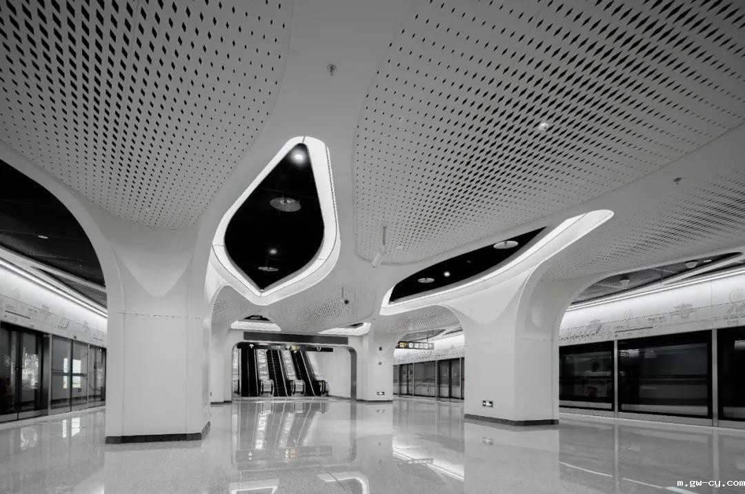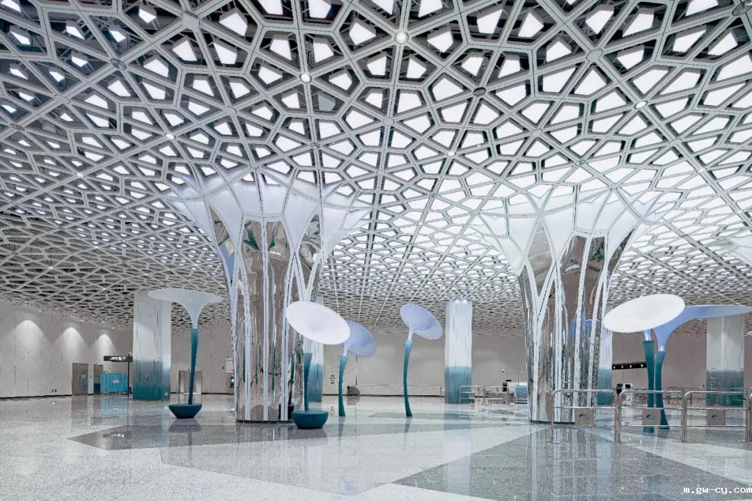 金属构件交汇于站点核心区域形成完整的空间艺术品,巧妙融入蓉城市花元素,寓意成都轨道交通全面绽放发展的美好愿景。
