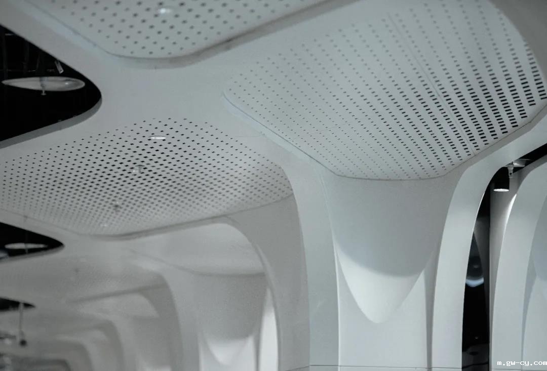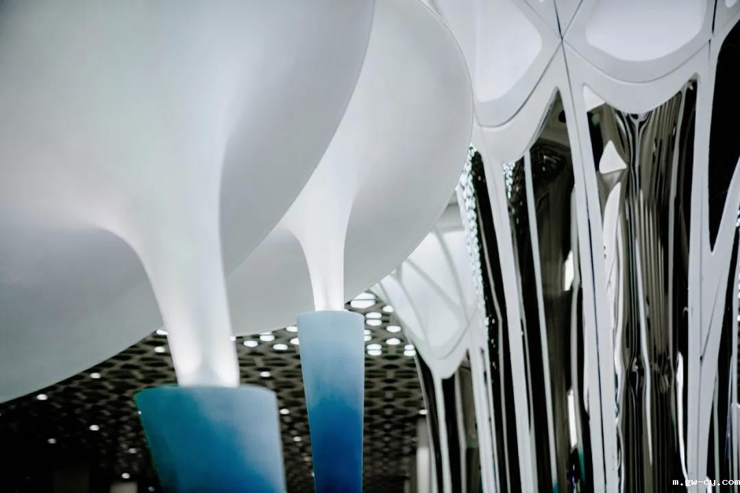 纯净而谦逊的色彩与丰富明亮的内部空间带来的双重性体验。室内天花造型参考了环球中心的流动性和延续性,不仅与室外建筑环境形成了巧妙的联合,还以一种瞩目的方式展示出了自身与众不同的艺术气质。