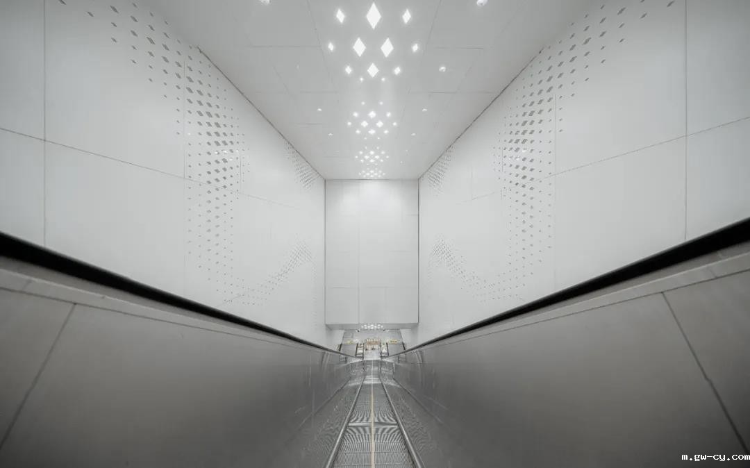 菱形灯阵列间隔排列,结合渐变透光穿孔被塑造为引导乘客前进的“箭头”,金色轨道婉若游龙,以艺术化的交织金属构件串联空间,复古与时尚的碰撞,勾勒出一幅高贵典雅的盛景,演绎了空间曲直坚柔的韵律之美。