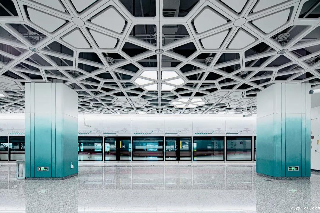 基于其作为重要的枢纽地位,J&A以“天府新城”为主题,提取“城市万花筒”的设计元素,借助三角形基础形式构成的互联系统,整体的几何体块进行调整和改变,打造一个简洁大气、开敞明亮的枢纽地铁空间。