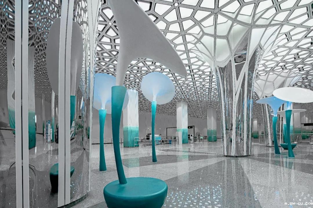 J&A巧妙运用原始场地空间优势,通过造型铝板、不锈钢等材料将天花与柱子进行一体化设计,放眼望去,空间尤显得更加开阔。别致的喇叭花造型座椅、内部活跃的艺术氛围都共同描绘未来天府中心万花齐放的美好画卷。