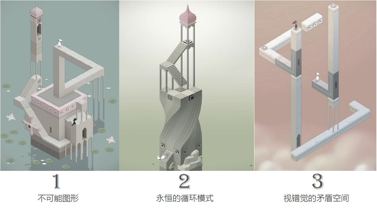 “纪念碑谷”这款游戏之所以让人喜爱,不仅因为它在美学设计上的惊人表现,同时它还娴熟地将矛盾空间放在二维世界中,让玩家在解谜的同时,沉浸在这错落有致的矛盾空间当中。