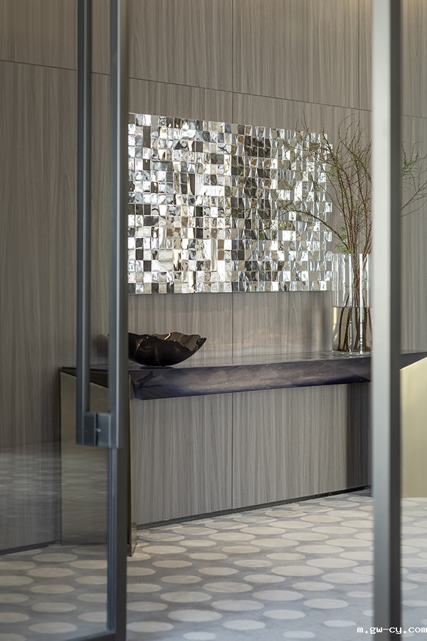 艺术贴膜玻璃似隔非隔,为空间组合出丰富的层次关系。中性的色调营造出高级的商务感,赋予空间沉稳内敛的氛围。