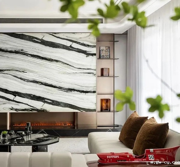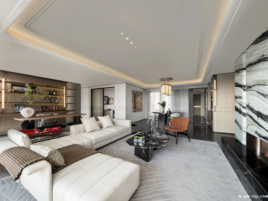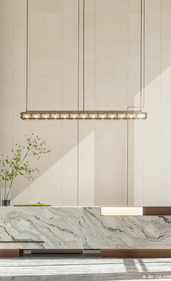 主要材料:拉图白大理石、宇宙金大理石、古铜金不锈钢、木饰面