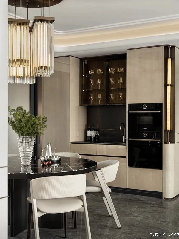 客厅部分的空间十分开阔,白色沙发美观而舒适,意式的轻奢风格给人以难忘的印象。厨房、酒窖一字排开,超大的空间尺度与收纳功能,让居家生活井井有条。