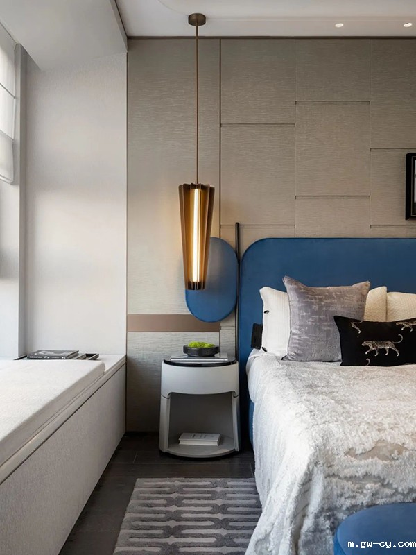 次卧静谧舒雅,以沉稳的色彩、简约的线条渲染出一片安宁之地。于优雅惬意中透露出岁月的宁静。