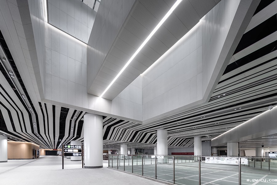 天窗的遮光百叶设计为“控光大师”,百叶格栅采用特殊角度及造型,调节昼夜光线,缓解空间内温度压力,实现节能减排。枢纽整体装修风格统一,材料选择上突显自然肌理的同时,展现建筑、室内空间一体化的设计语言。