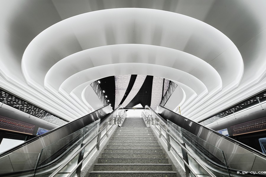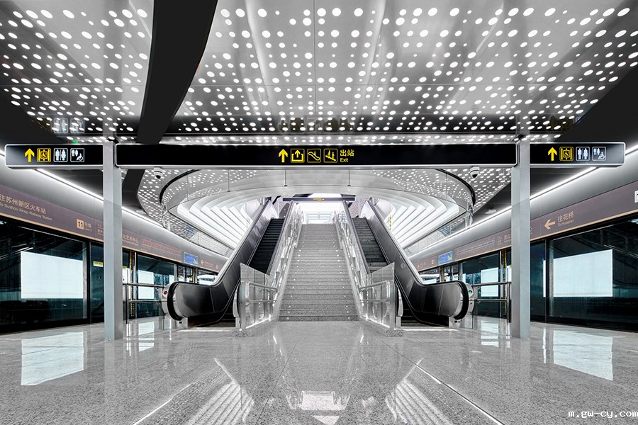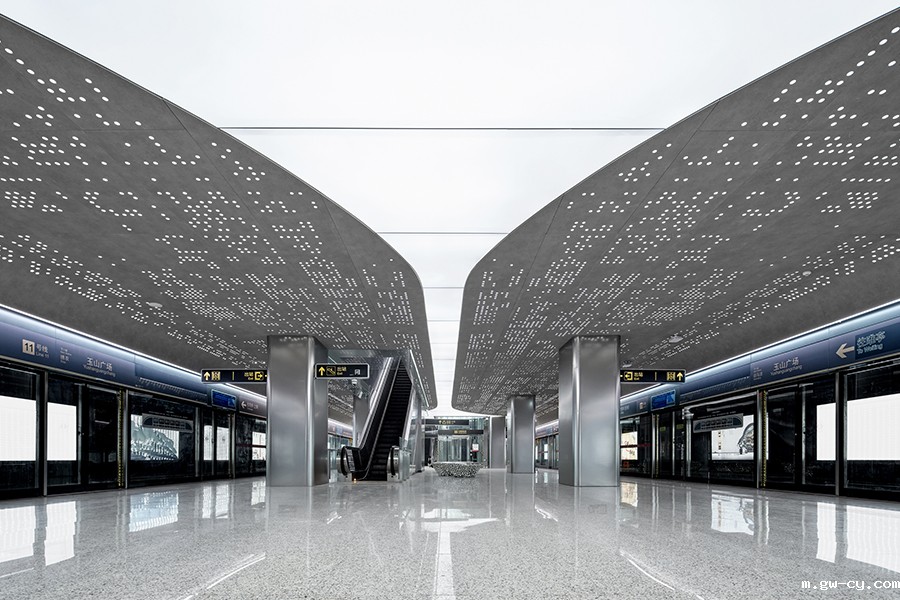 玉山广场站位于昆山中心城区核心区位,设计团队以“玉山雅集”为设计主题,将昆山亭林园建筑的精巧、昆石的玲珑、昆曲的精致融为一体。整个车站采用清水混凝土饰面肌理营造最原始的建筑空间视觉效果,扶梯洞口侧面单独设计艺术灯具。