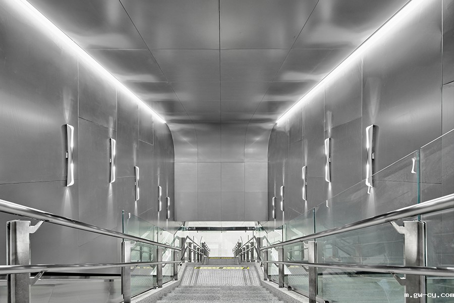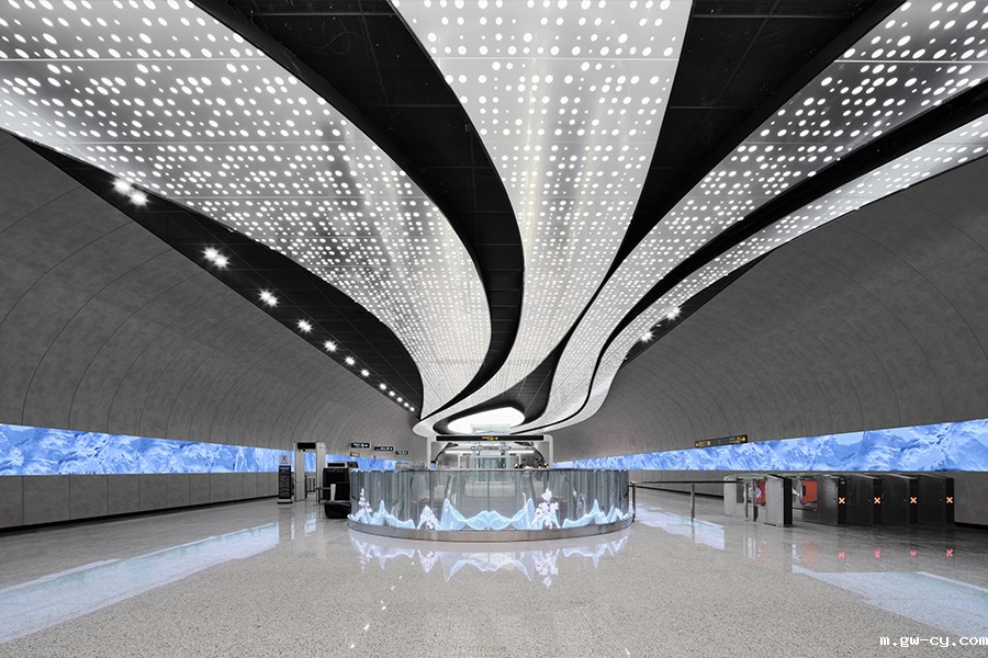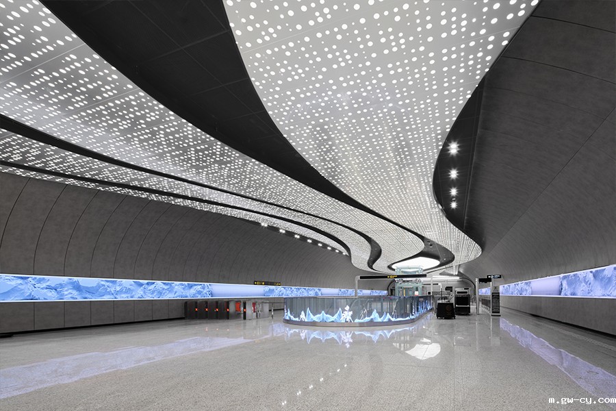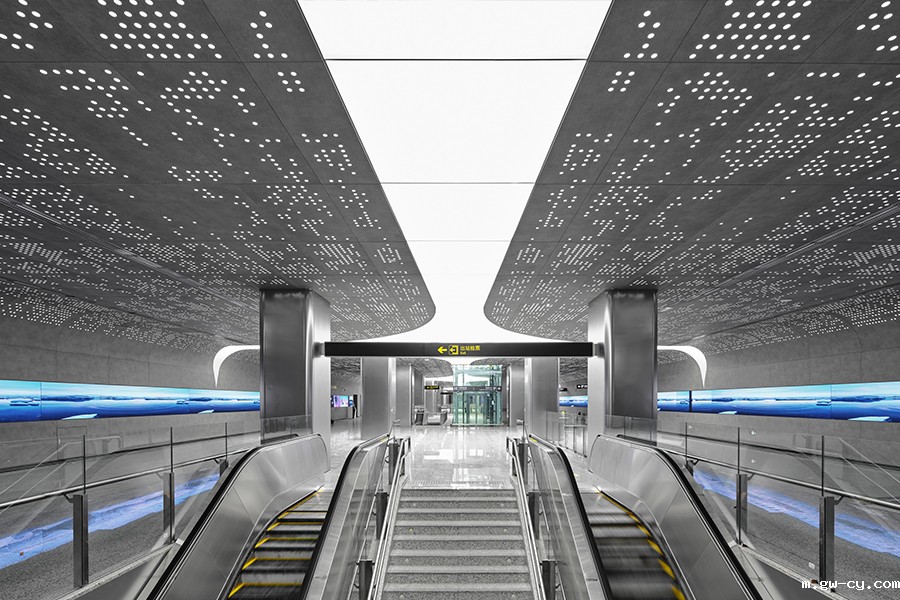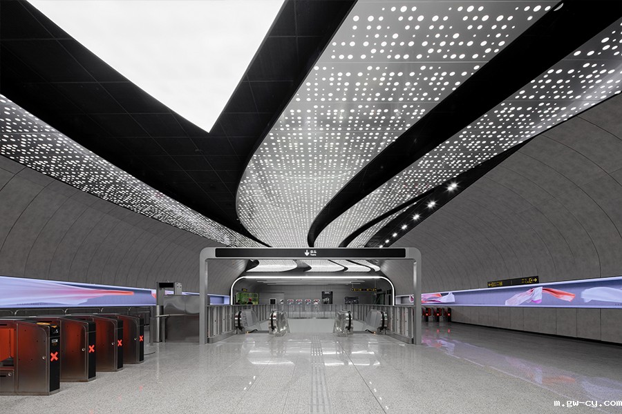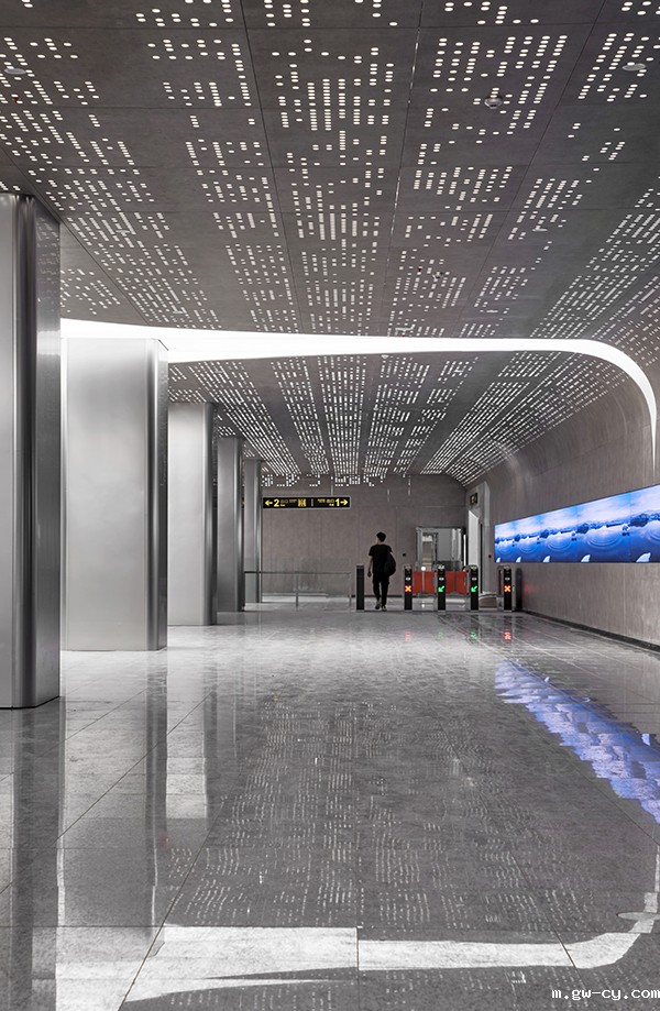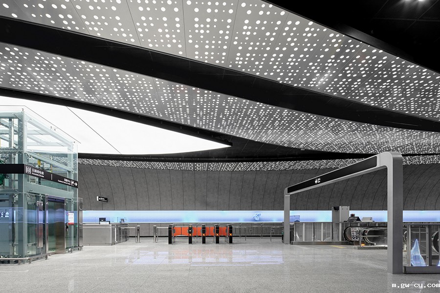 光环境是本站的设计重点,不同角度的灯光从孔洞中射出,营造阳光穿透昆石的既视感。大面积的仿天光设计打破地下空间的视觉束缚,为乘客带来更加舒适的空间体验。
