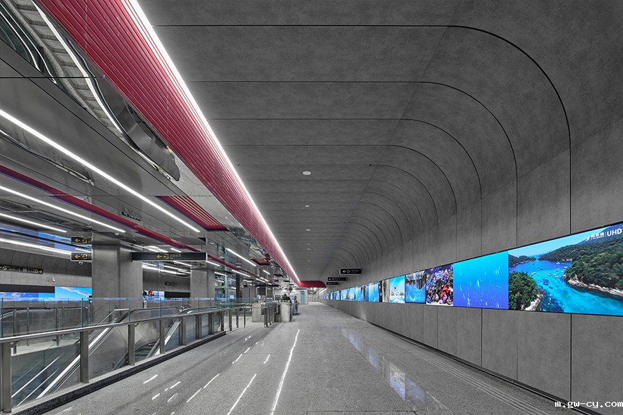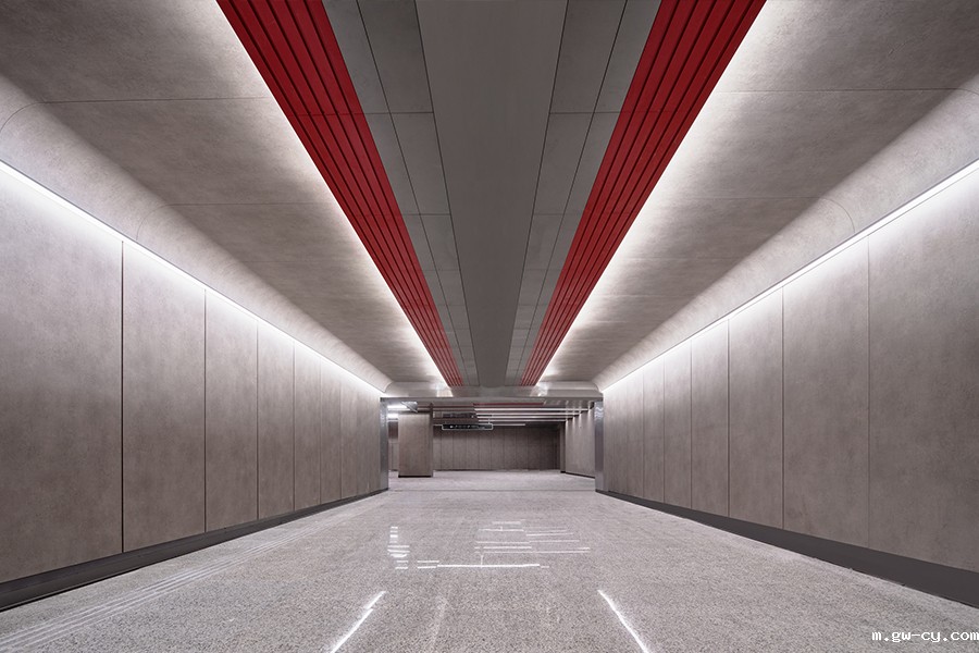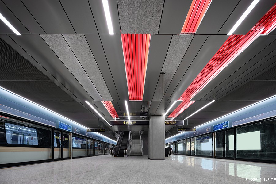绣衣站因靠近昆山老城的绣衣弄而得名,空间以“昆曲中心的空间映射”为设计主题,综合运用红色金属板、镜面不锈钢条板、雾面不锈钢条板、清水混凝土肌理铝板等多种材质,呈现现代前卫的空间风格,更是将昆曲元素延伸到地下车站。