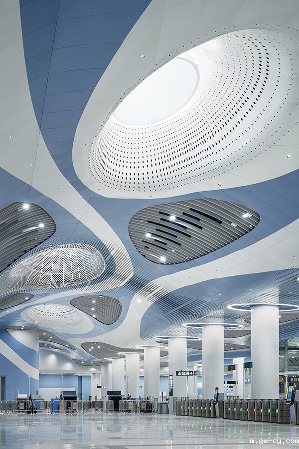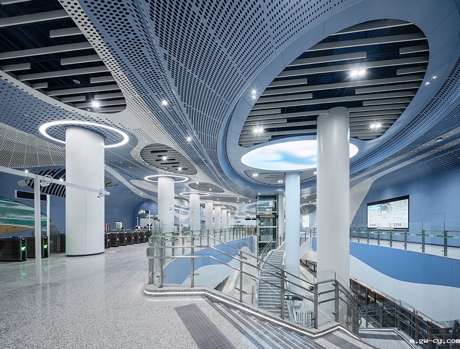 车站两侧天花结合海洋生物造型元素与色彩,结合镂空剪影设计,灯光投射在墙面上,创造出如同阳光洒落海面的虚实光影效果。