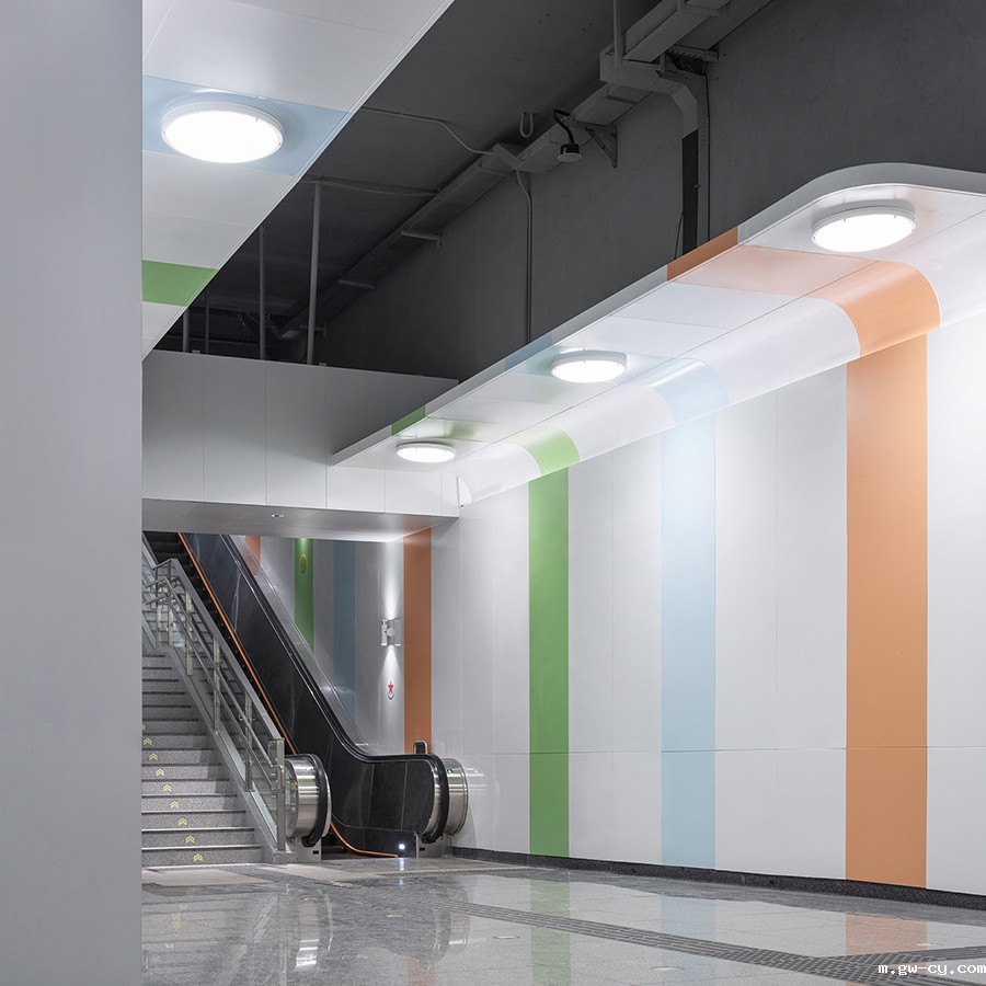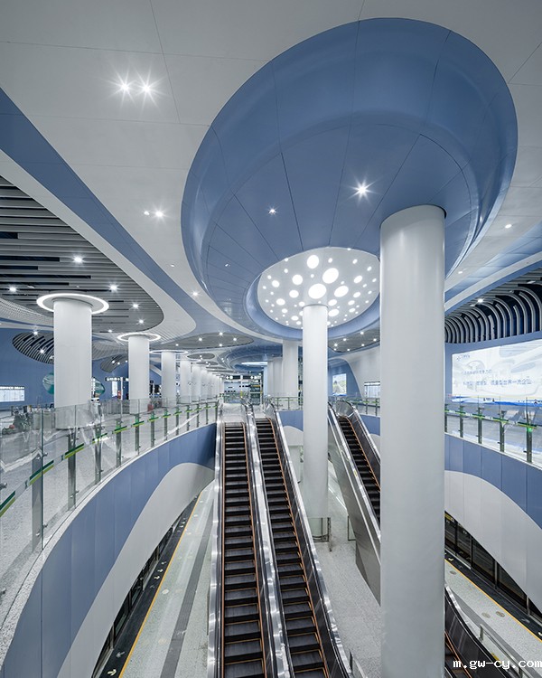 车站两侧天花结合海洋生物的造型元素与色彩,楼扶梯中央七彩珊瑚形态艺术造型柱成为车站的视觉焦点。