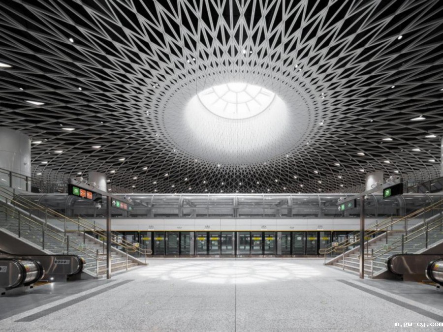 考虑到深圳之眼岗厦北交通枢纽作为深圳城市地标、乃至全国标志性综合体的重要意义,J&A在前期构思上就确定了项目的主基调。作为多条地铁的交汇处,岗厦北交通枢纽占地数十万平方米,设计师希望向地下空间中引入更多自然光线,并打造一个具有强烈视觉冲击力的空间形态。为此,设计采用了费马罗线这一参数化设计模型,将数学和图形艺术相结合,营造出具有前瞻性、未来感的视觉效果。同时,大部分原材料在工厂加工后,于施工现场安装,践行了低碳环保的设计理念。