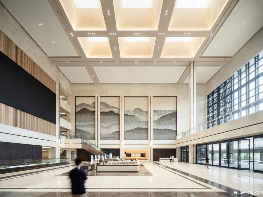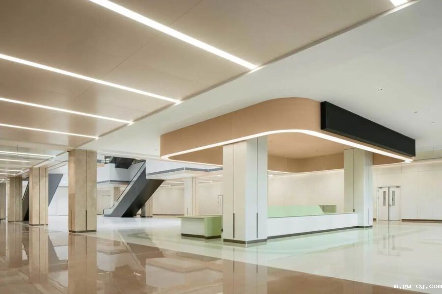 主大堂两侧借鉴中国传统画九重山的形态,连绵起伏的山脉展现出沉稳宽厚的气质,宛如中医所追求的人体脉象的平和与稳健。