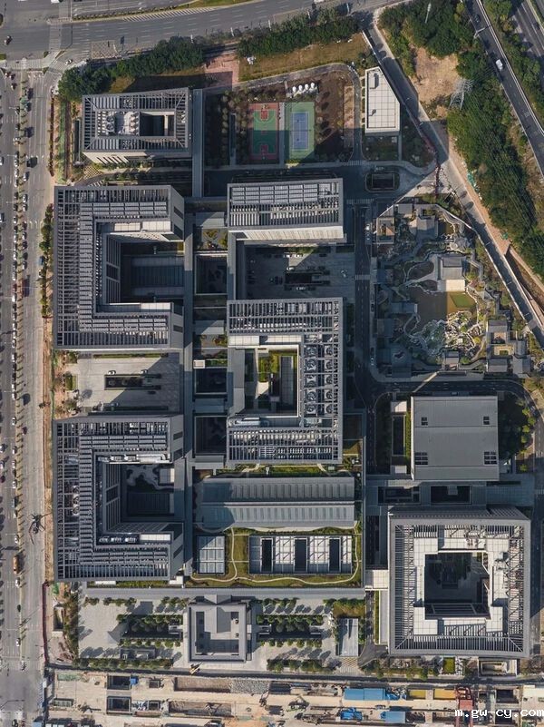深圳中医院光明院区采用院落式、园林化的总体布局,以“凹”字形体量作为建筑母题,一连串“凹”形体量互相错动,形成半围合空间结构,使得“苑、园、院”相互交融、衔接自然,营造出虚实相生、阴阳和谐的独特格局。