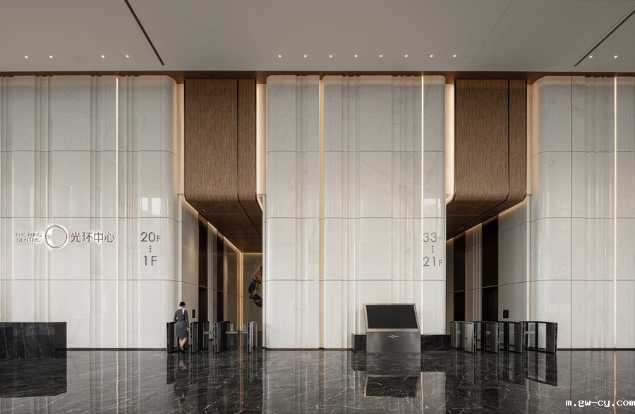 光环中心的大堂设计以米色打底,描绘现代典雅的空间气息。每一处细节都经过精心雕琢,简洁的线条勾勒出空间的轮廓,考究的装饰点缀其间,共同编织出一个时尚而温馨的接待空间。