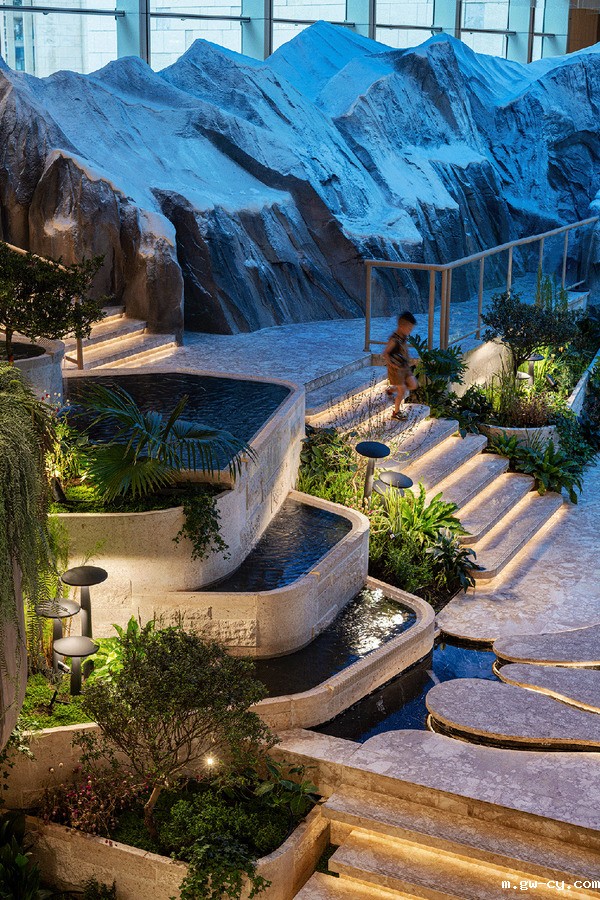 设计团队从“贡嘎雪山”中汲取灵感,运用山石、叠瀑、森茂三重意象,将一座雪山缩影置于其间,营造了一座具有成都气质、细腻柔美的山林景观。