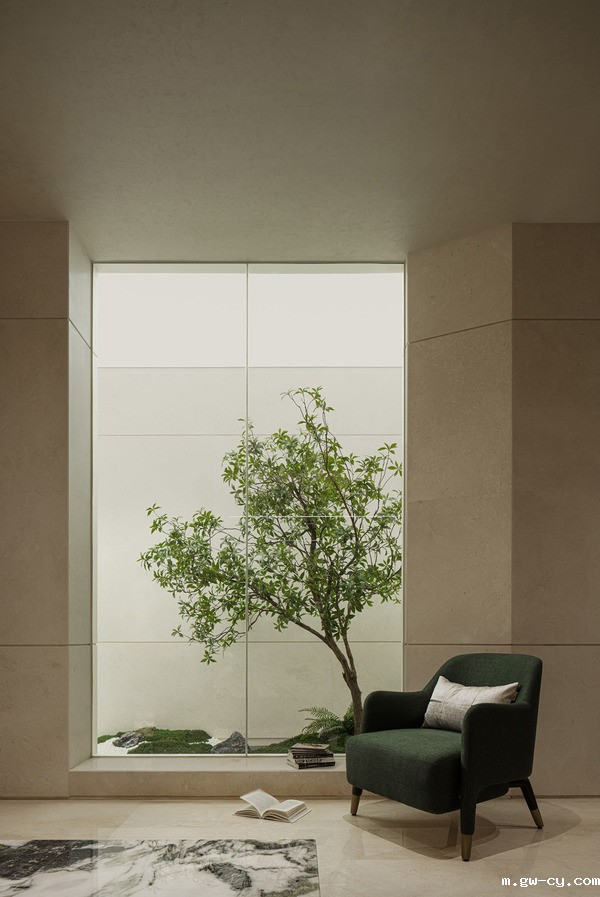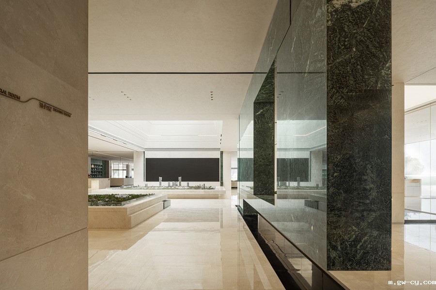 J&A在品牌展示区到沙盘区之间植入了一条园林洄游动线,在起承转合中强化场景体验感。悬挑的绿色奢石造型背景,将人的视线自然引导至沙盘区,人们在漫步中细细感受东方园林的深邃与雅致。