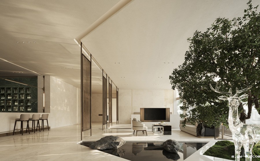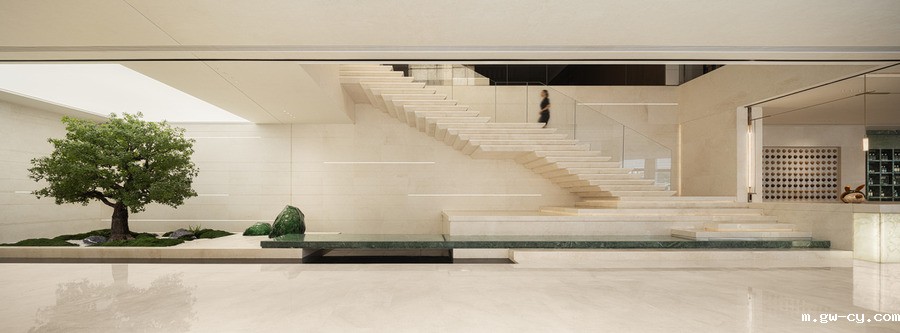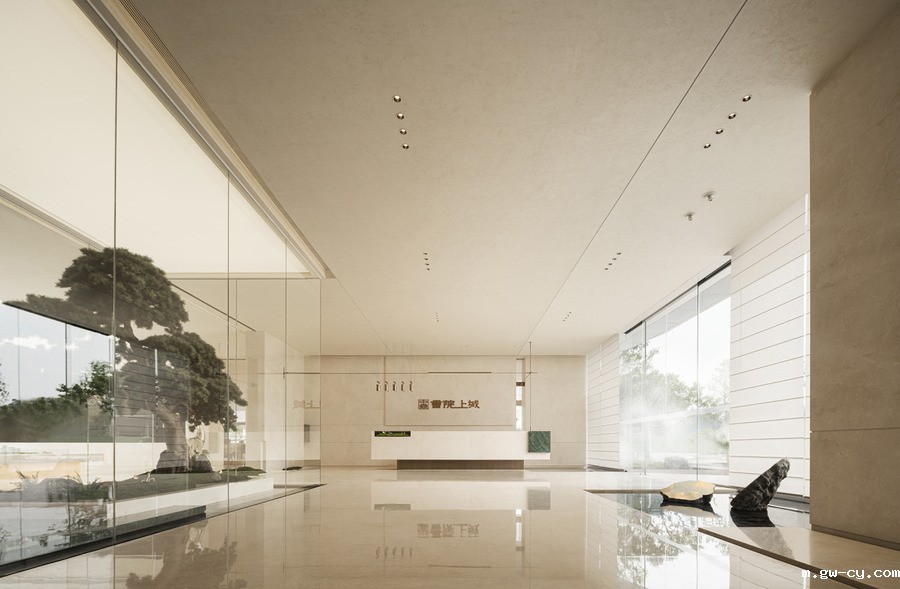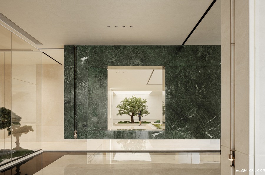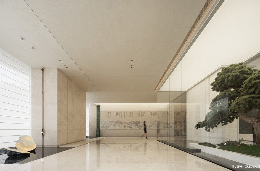 前厅以山水意象为主导,占据空间核心,入口流动的水景营造柔和清新的氛围,枝干分明的松树则展现了坚毅自由的姿态。刚柔并济下映射出深远的文化底蕴和历史记忆,让人在现代与古典之间感受到深刻的情感共鸣。