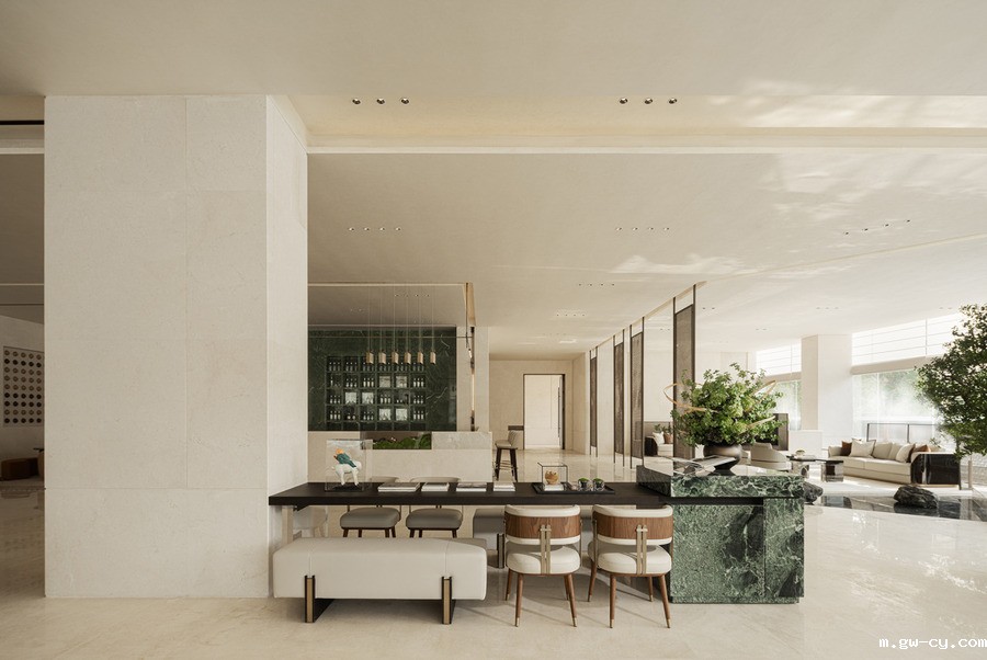 吧台背景选用绿色奢石营造有序的的空间氛围,空间局部则点缀了拥有润泽质感的透光玉石。关于玉石,山赋予了它坚实的身体,水雕琢了它流畅的形态,它们是山水精神的另一种诠释,在灯光映衬下,熠熠生辉。
