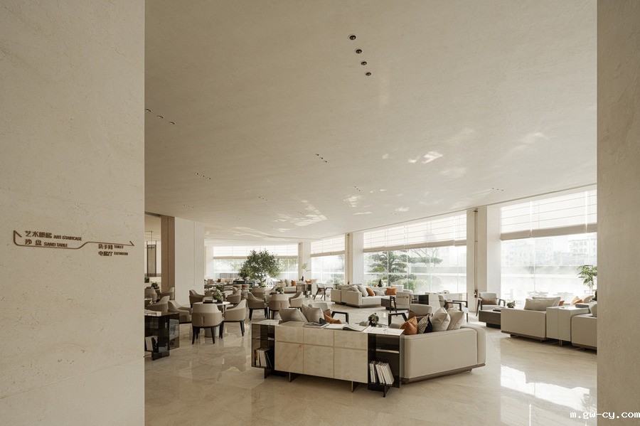 步入沙盘区,映入眼帘的是双层挑高的空间设计,二楼顶部的天窗将自然光引入室内,使得整个空间沐浴在柔和的光影之中。在这里可以随着时间的流逝,捕捉到日光的变幻与游移,感受光影与空间交织出的美妙旋律。