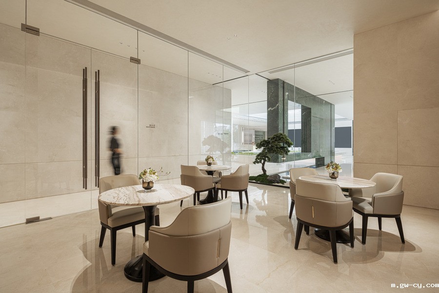 深度洽谈区地面以水而隔,立面采用金属网屏风划分出独立的空间,打造山水庭院式的生活体验,大面积的玻璃幕墙引入自然光线与景观,让人仿佛置身于水面之上、摇曳的树梢之间,自然而然地放慢生活的节奏。