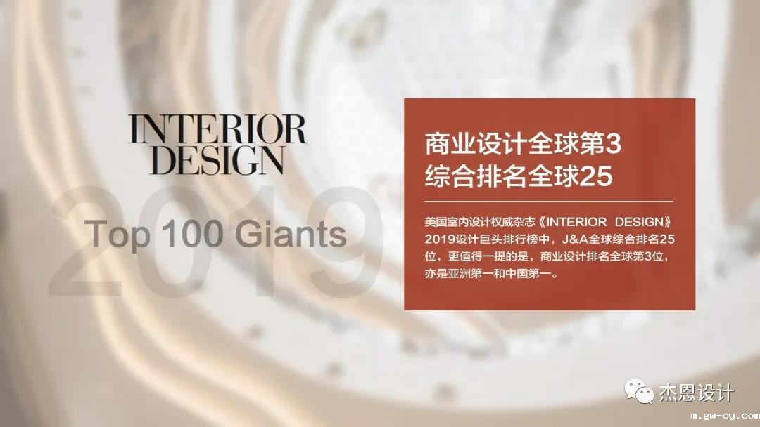 2017年,J&Abetway开户网站成为中国首家登录A股资本市场的室内设计企业,在美国权威杂志《INTERIOR DESIGN》全球设计巨头排行榜中,亦一路跃升,综合实力全球排名第25位(2019),在商业设计领域连续2018、2019两年稳居全球第三,刷新了中国商业设计在全球的排名。