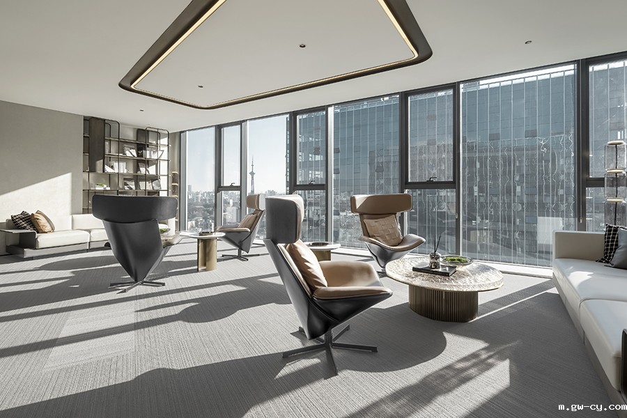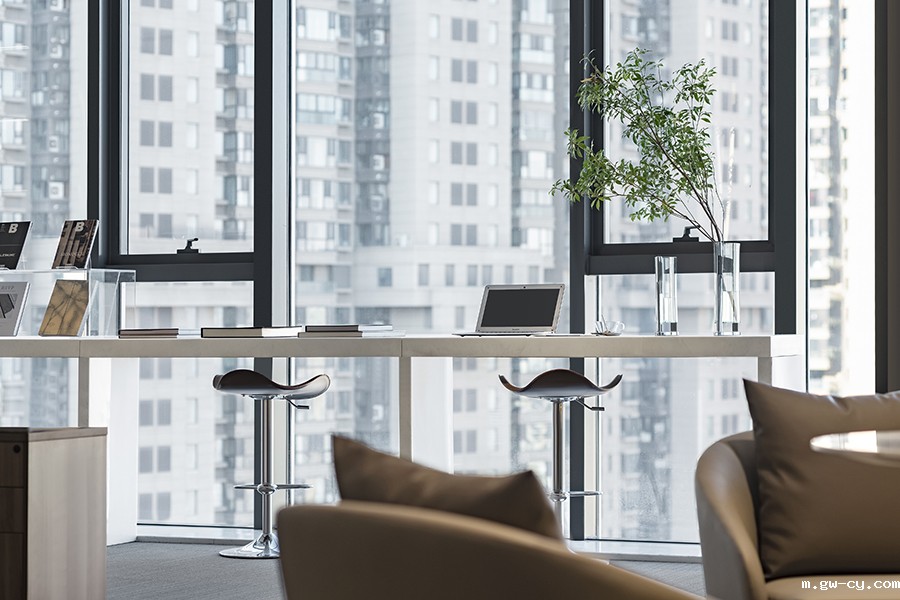 艺术贴膜玻璃似隔非隔,为空间组合出丰富的层次关系。中性的色调营造出高级的商务感,赋予空间沉稳内敛的氛围。