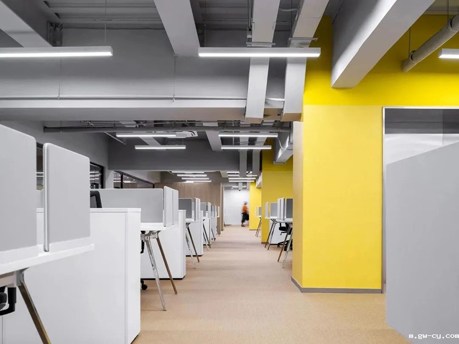自用办公区风格也以简约为主,开放式吊顶与大面积的暖灰色运用,局部添加logo的明黄色让空间更有活力。