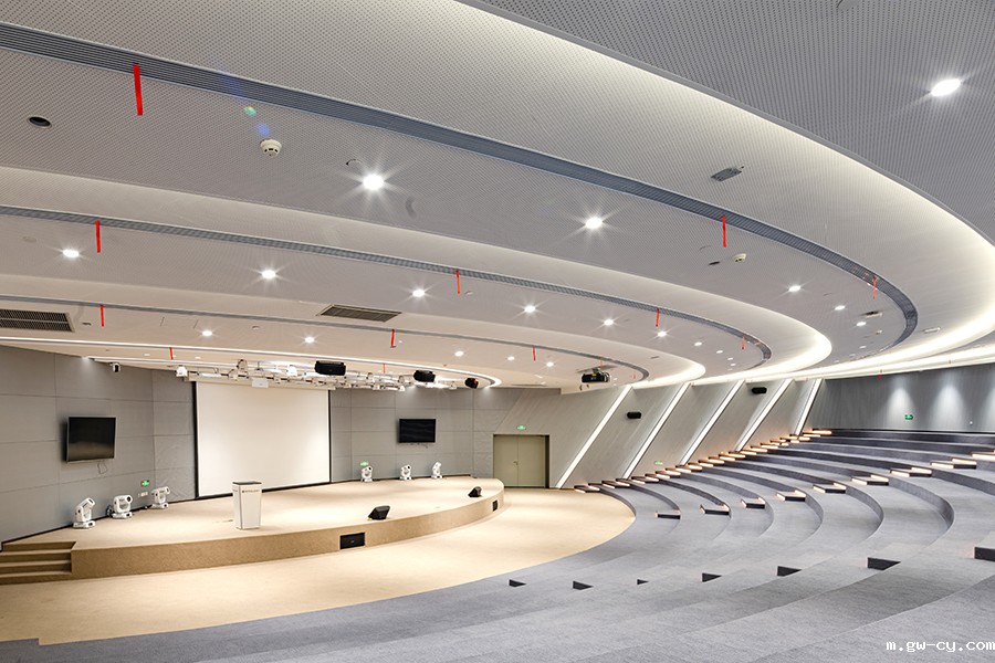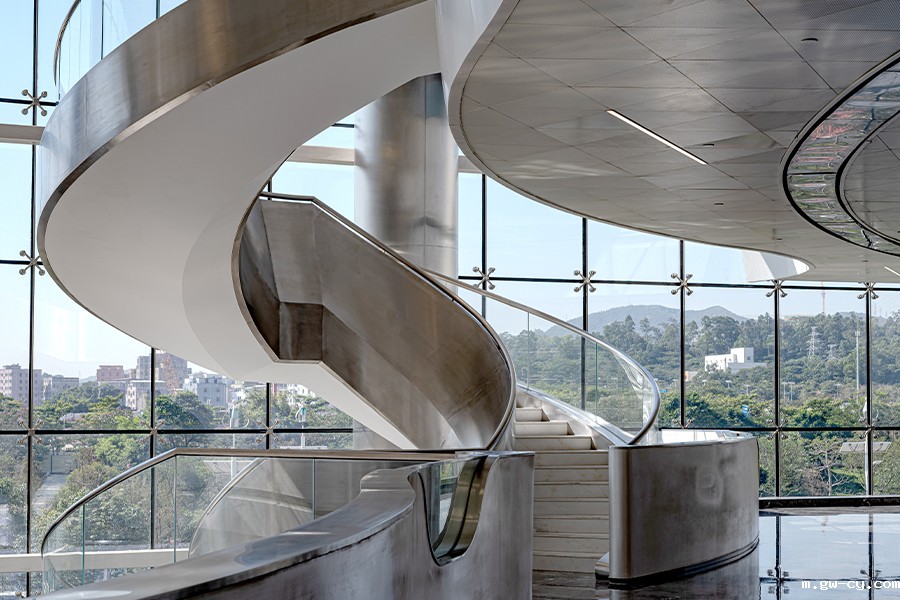 大堂简洁明亮,给人带来独特的空间体验。沿着弧形楼梯拾阶而上,领略每一层不同的风景。圆形报告厅犹如宇宙之初营造出天地混沌的空间体验,激发出无限的可能。整体室内空间呈现柔中带刚的力量曲线美。
