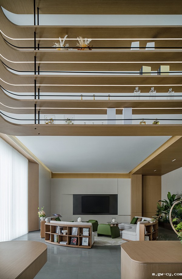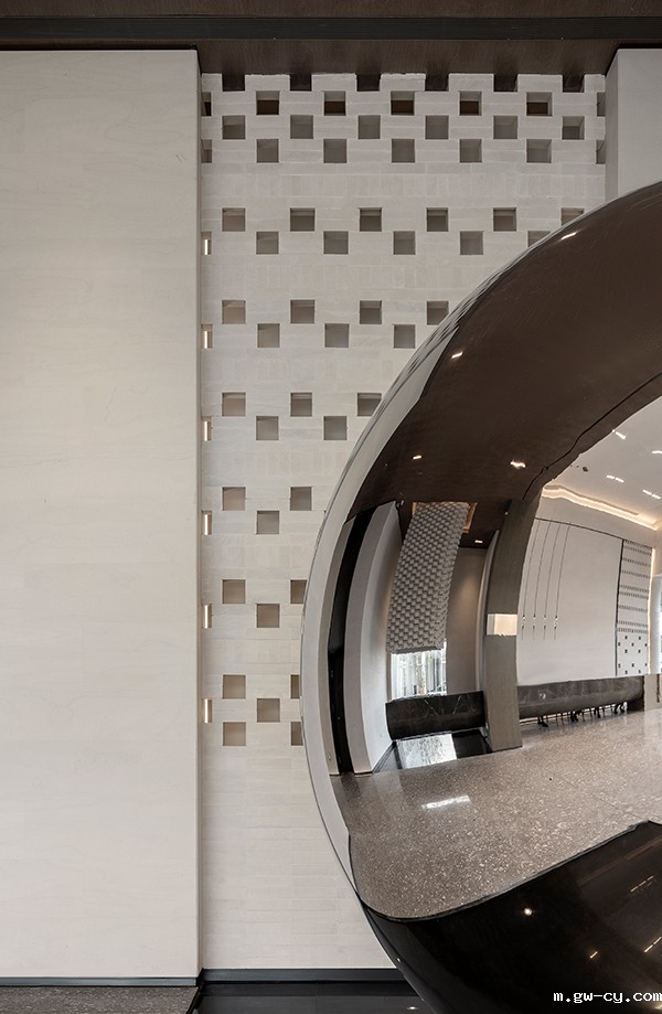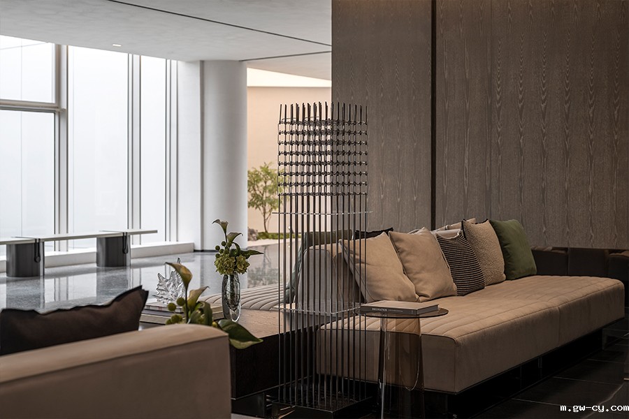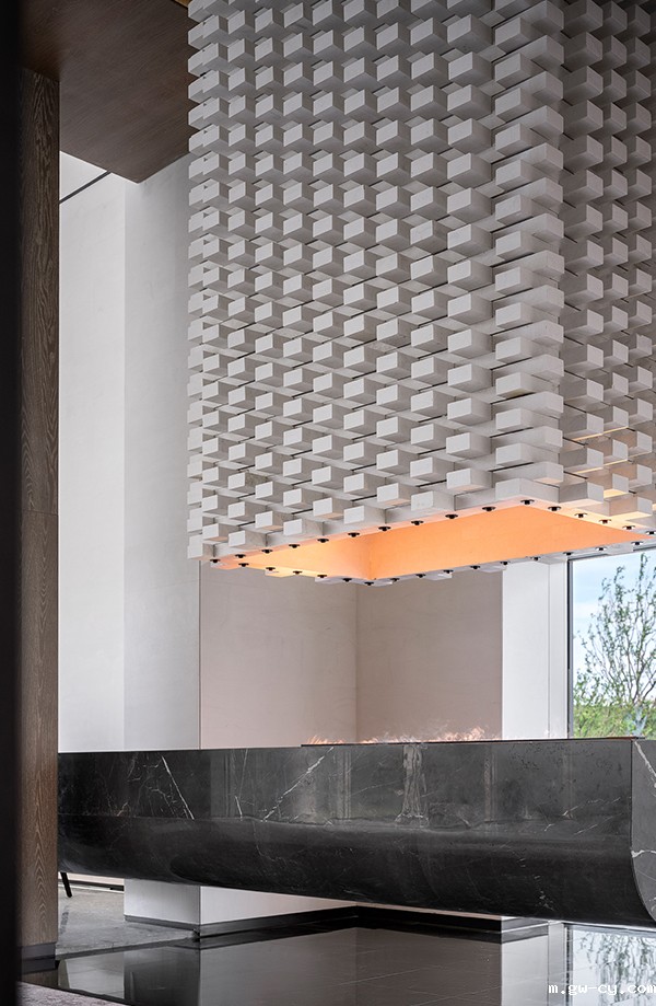 白纹板石材、金属、木饰面、玻璃等不同材质相互碰撞,塑造别样的空间质感。简约的线条勾勒出精致的格调,在多样的光影效果下,形成组合成丰富的空间层次。