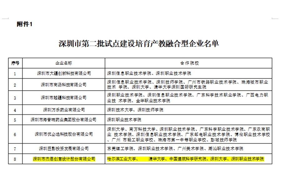 近日,深圳市发展和改革委员会公布了《深圳市发展和改革委员会深圳市教育局关于深圳市第二批产教融合型企业入库培育的通知》深发改函〔2023〕308号,本次共有29家企业入选,深圳市杰恩创意设计股份有限公司荣列其中,并被纳入产教融合型企业储备库。