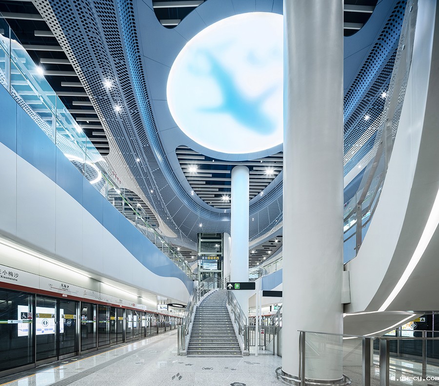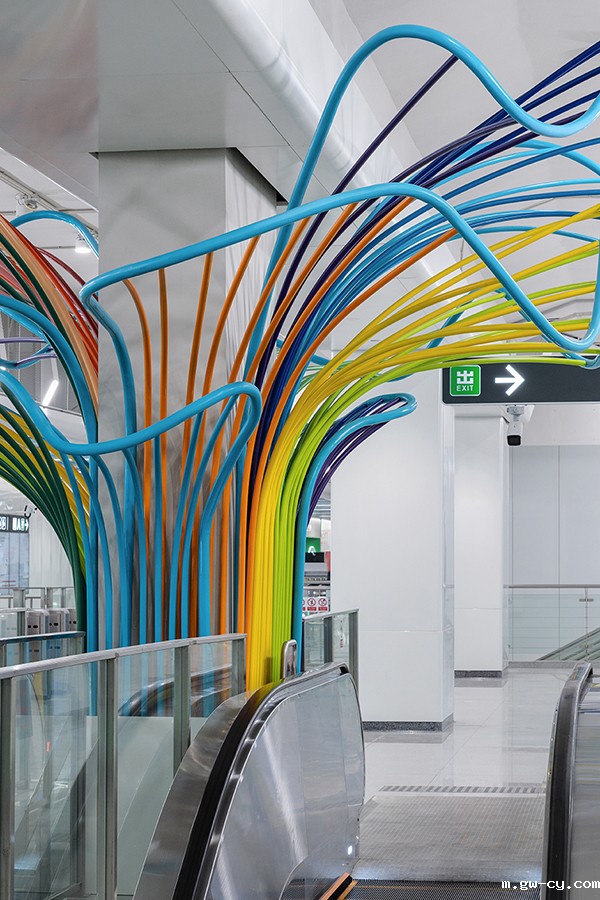 车站两侧天花结合海洋生物的造型元素与色彩,楼扶梯中央七彩珊瑚形态艺术造型柱成为车站的视觉焦点。