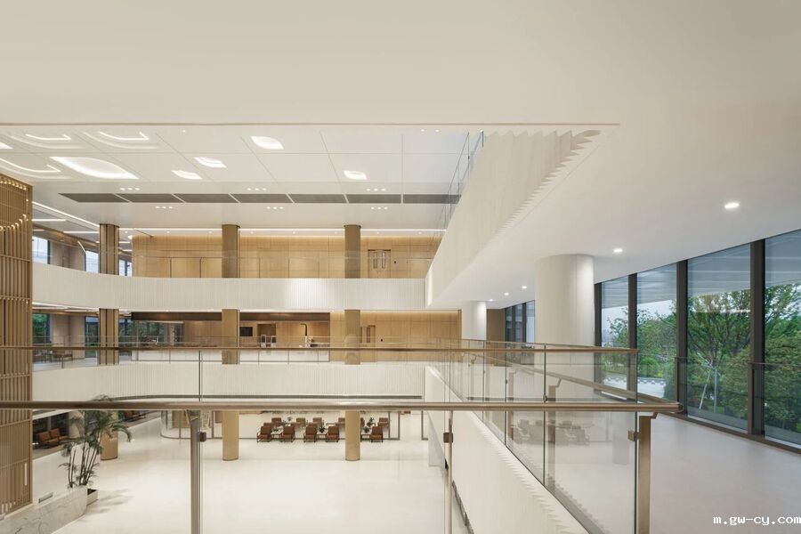 大堂内部利用自然光、生态材料以及与树叶相关的色彩和形状,营造出一种温馨而舒适的氛围。