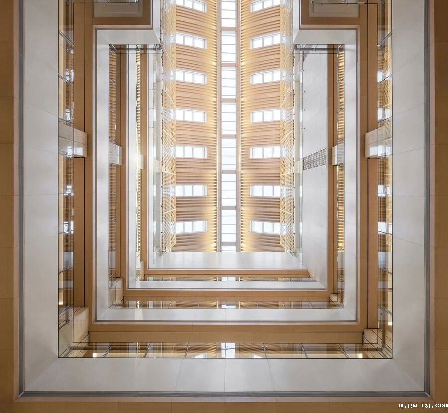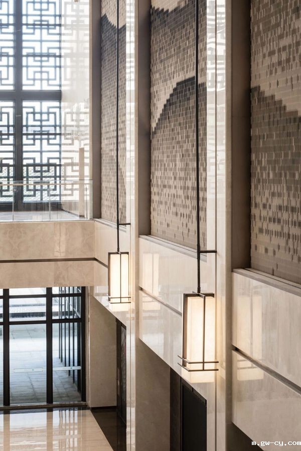 中庭两侧,垂直而下的格扇通花借由光线与“屏”的微妙变化,使自然光层叠洒落,透露出温柔的美感。同时,这一设计极大地节省了照明能耗,是绿色设计的杰出典范。