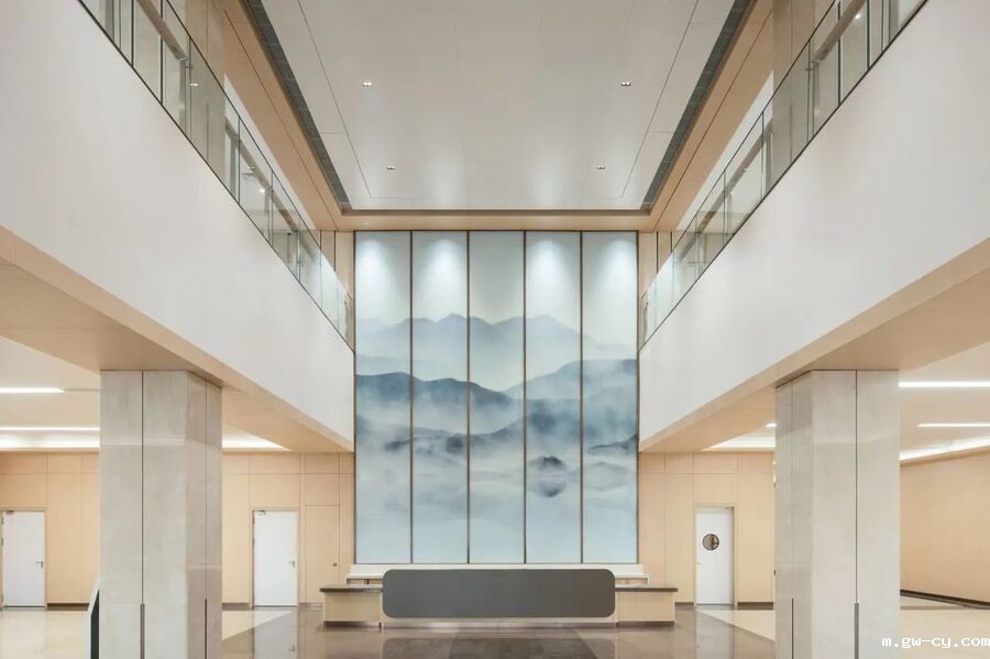 急诊大厅的山水写意画,运用现代砂雕艺术玻璃工艺模拟自然山水,既展现出自然的灵动,又蕴含着传统的沉稳,仿佛在诉说着中医天人合一的哲学观念。