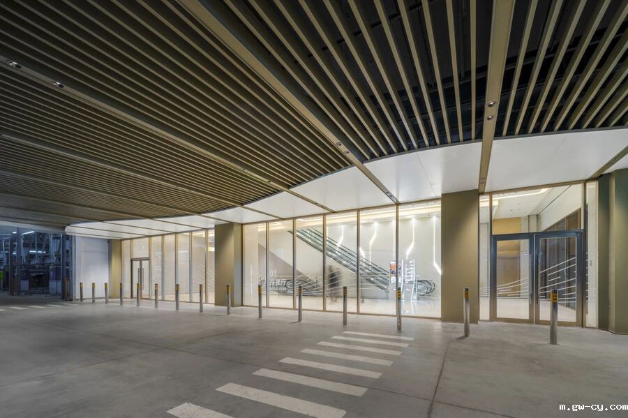 主入口延续建筑外观的流线型设计,夜幕降临后,数百根金色铝管在灯光照射下熠熠生辉,为入口增加了韵律感与层次感。