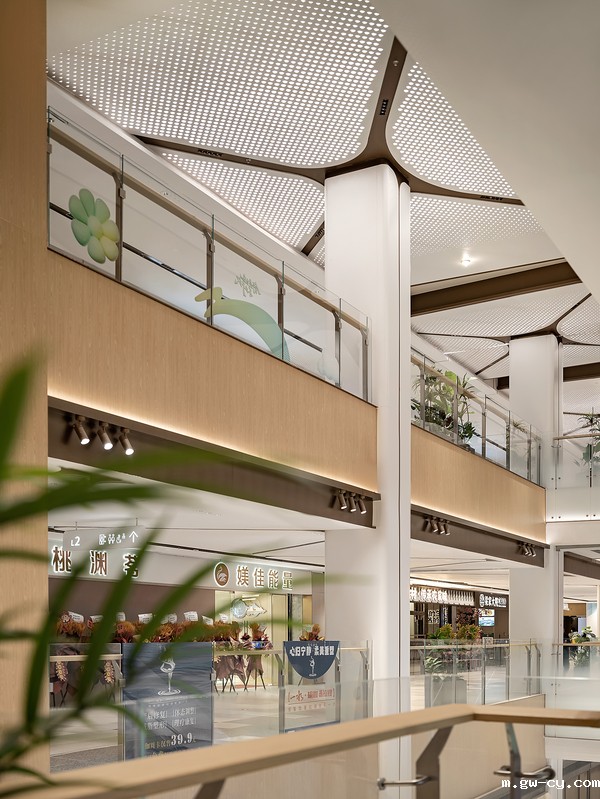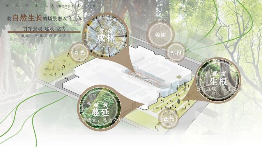 中庭区域原本层高较低,为营造漫步林中的购物体验。设计团队通过模拟树冠的簇拥和树干的序列,打造生态雨林般的中庭空间。