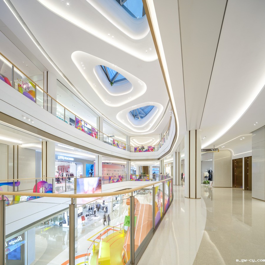 主中庭以“流水”的形态勾勒空间轮廓,顶部结合雨花石造型天窗,通过简洁精致的设计手法,贯彻“轻硬装重氛围”的理念,塑造极具记忆点的空间特色。