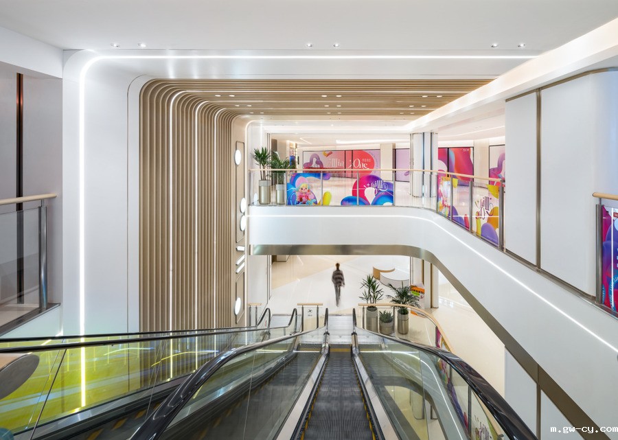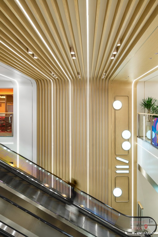 扶梯内嵌于店铺之间,通过包裹式的设计优化周边实墙的视觉感受,同时显著提升了扶梯入口的昭示性。