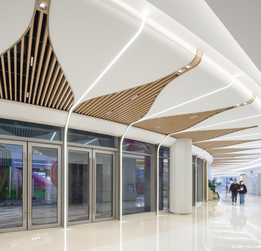 天花造型的倾斜度巧妙设计为尽量垂直于人的视线方向,最大程度优化了入口处的商业展示效果。